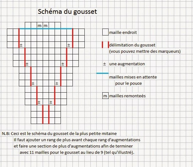 Faites 2(3) rgs sans augm, puis commencez les augm du gousset du pouce: