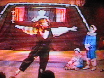 Rigolo entre, suivi des 3 petits clowns suspendus. Ils essaient de réveiller les 4 personnages, mais ça ne marche pas.
