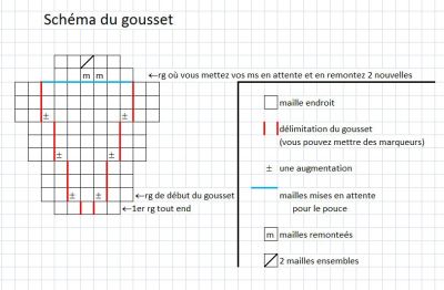 Vous faites les augm de part et d’autre de la 3ème m (cette m devient 3 ms), puis tric 2 rgs sans augm. Faites une augm de part et d’autre des 3 ms du gousset (elles deviennent 5 ms)…continuez ainsi jusqu’à avoir 7 ms pour le gousset (incluant la m du début). Tric 2 rgs sans augm. Vous allez mettre en attente les 7 ms du gousset ainsi: Tric les ms avant gousset (2 ms), mettez les 7 ms sur 2 épingles à ressort, montez 2 ms (méthode au pouce) et rejoignez vos nouvelles ms à celles qui suivent le gousset et continuez de tric en rond. Voyez l’image ci-bas pour comprendre ce que vous faites pour le gousset.