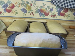 Graissez vos 8 moules à pain: parfois je me sers d’une partie de la pâte pour faire des petits pains, des baguettes, de la pâte à pizza(que je fais congeler à ce moment), des miches…Laissez lever dans les moules 3/4 d’heure à 1 heure(si vous avez 2 fournées, n’attendez pas trop, car imaginez la 2ème fournée!).