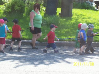 Ça ne va pas vite parce qu’il s’agit qu’un seul arrête et le « convoi » est en panne. Parfois, il y en a un qui pleure..mais qui avance quand même! D’autres fois, il y en a un(ou une) qui a l’air tout seul dans son monde. Et d’autres fois, une gardienne les fait chanter. Bref. c’est très rafraîchissant.