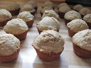 Ces recettes donnent environ 24 muffins. On peut aussi faire cuire n’importe quelle de ces recettes (en particulier celle aux bananes et celle aux courgettes) dans un moule à pain graissé et enfariné (il restera toutefois un peu de pâte: peut-être 6 muffins?) pour un pain de déjeuner. Mioum!