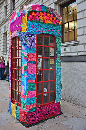 Je tricote presque toujours des choses utiles. Mais dernièrement, j’ai pris connaissance du « yarn bombing« . C’est un petit acte de protestation et provocation fait par des tricoteurs(euses). Ils mettent du tricot dans des endroits publics, donc illégalement, pour mettre un peu de couleur dans la grisaillerie de la ville et, probablement, pour s’affirmer en tant que tricoteuse dans un monde qui en rit un peu.