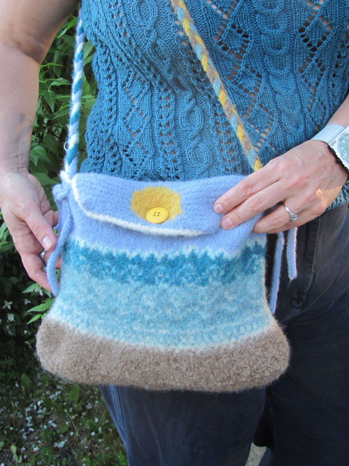 Voici un sac feutré figurant le bord de l’eau. Il est à la fois inspiré du bas St-Laurent et de mes voyages à Cuba.