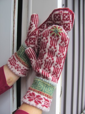 Mais non je ne vais pas faire ici ma liste de cadeaux de Noël! C’est le nom du patron de Torirot que je viens de faire: des mitaines qu’elle a appelées All I want for christmas. À noter que Torirot est une vraie Norvégienne et que ce patron est expliqué en Norvégien, en anglais…et en français! Il est très bien fait, très clair. Et moi, tant qu’à être dans l’état d’esprit des fêtes, je les ai fait dans des couleurs de Noël. Ça ne se voit pas bien sur la photo, mais je les ai fait feutrer ce qui les a encore plus améliorées.