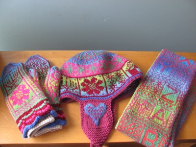 Et tant qu’à faire, je me suis fait un cadeau: le même bonnet et les mitaines plus épaisses de la collection pour aller avec l’écharpe alphabet que je m’étais faite.