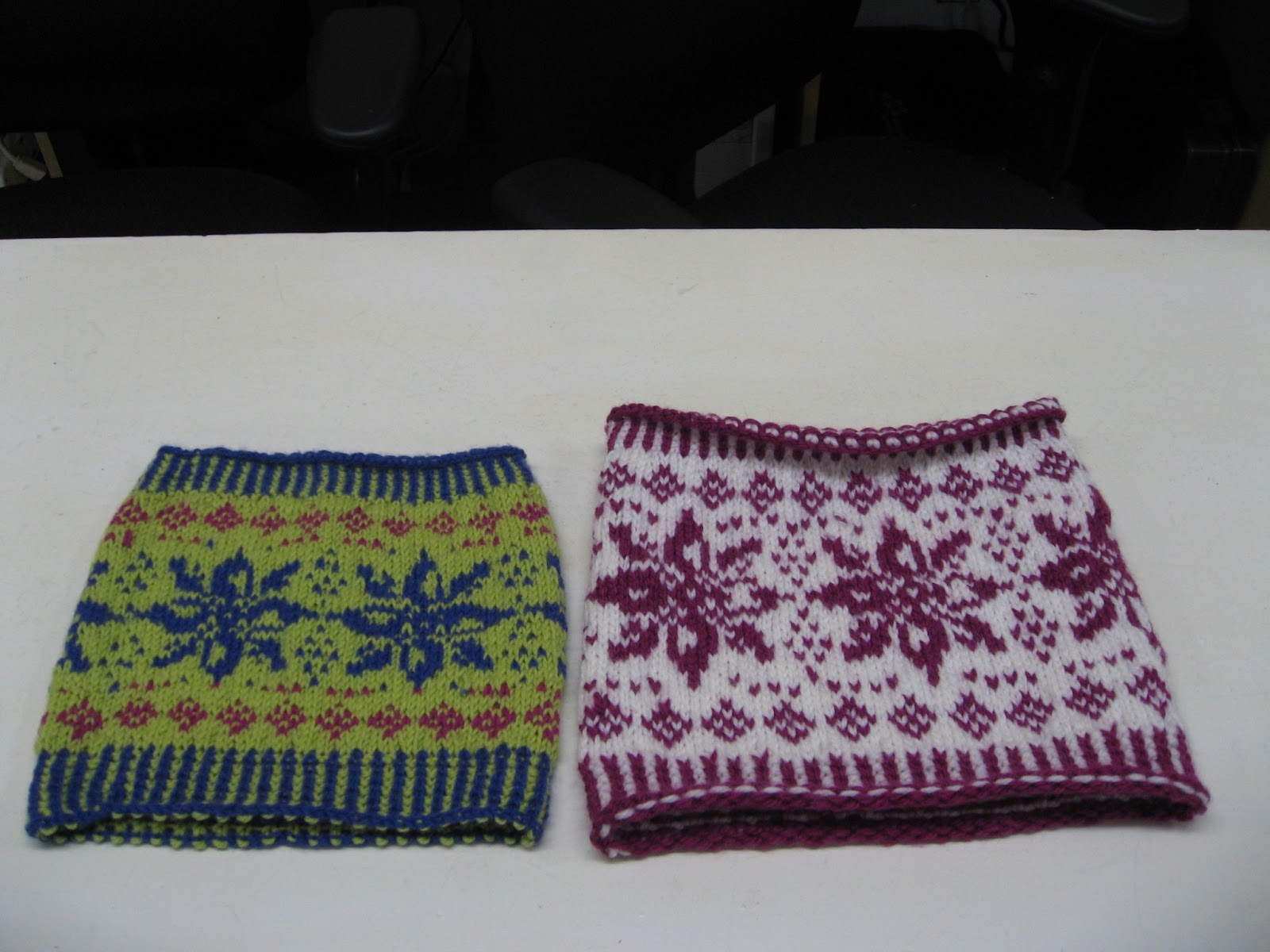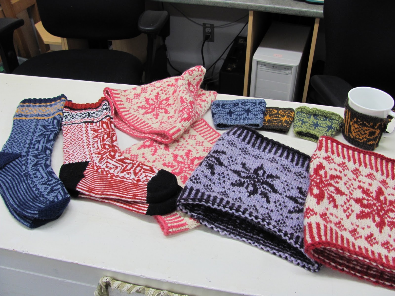 Voilà! Ma session de tricot est terminée. Je n’ai pas tout photographié: pardon à mes élèves de tricot en rond car j’ai oublié d’emporter mon appareil au dernier cours. Mais j’ai des photos des mes 2 cours de tricot jacquard (oui, pour une 2ème fois).