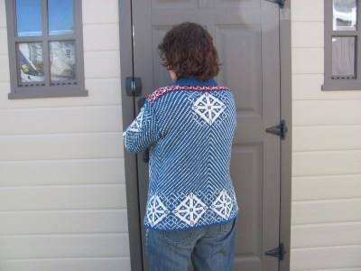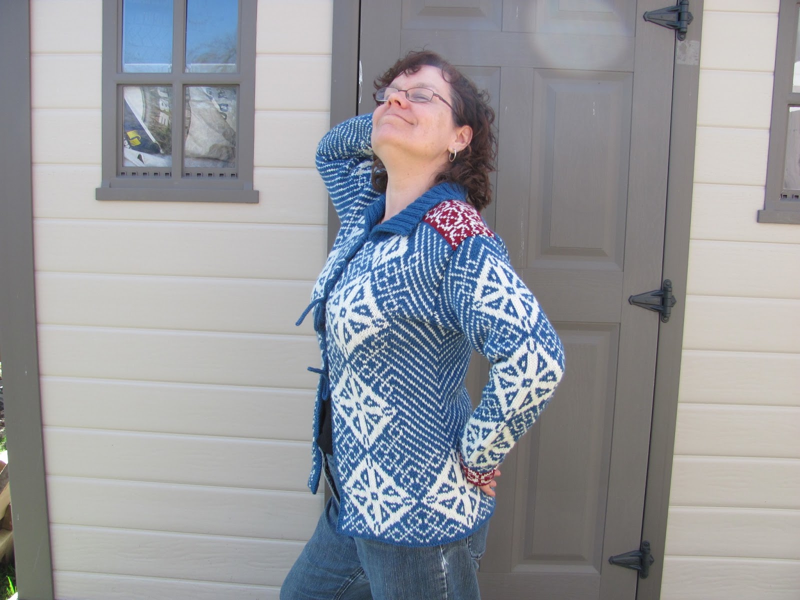 C’est mon propre modèle, tiré de mon motif symétrie no 3. Je l’ai fait pour aller avec le capuchon que j’ai fait pour mon cours de tricot de cet hiver. Je ne peux en faire un patron pour l’instant: je dois expérimenter afin de produire des patrons qui se comprennent. Et je « steek », c’est-à-dire que je tricote tout en rond, puis je coupe pour l’ouverture et les manches. Mais, contrairement à la tradition Norvégienne, j’ai fait une manche montée, donc une dizaine de rangs en aller-retour.