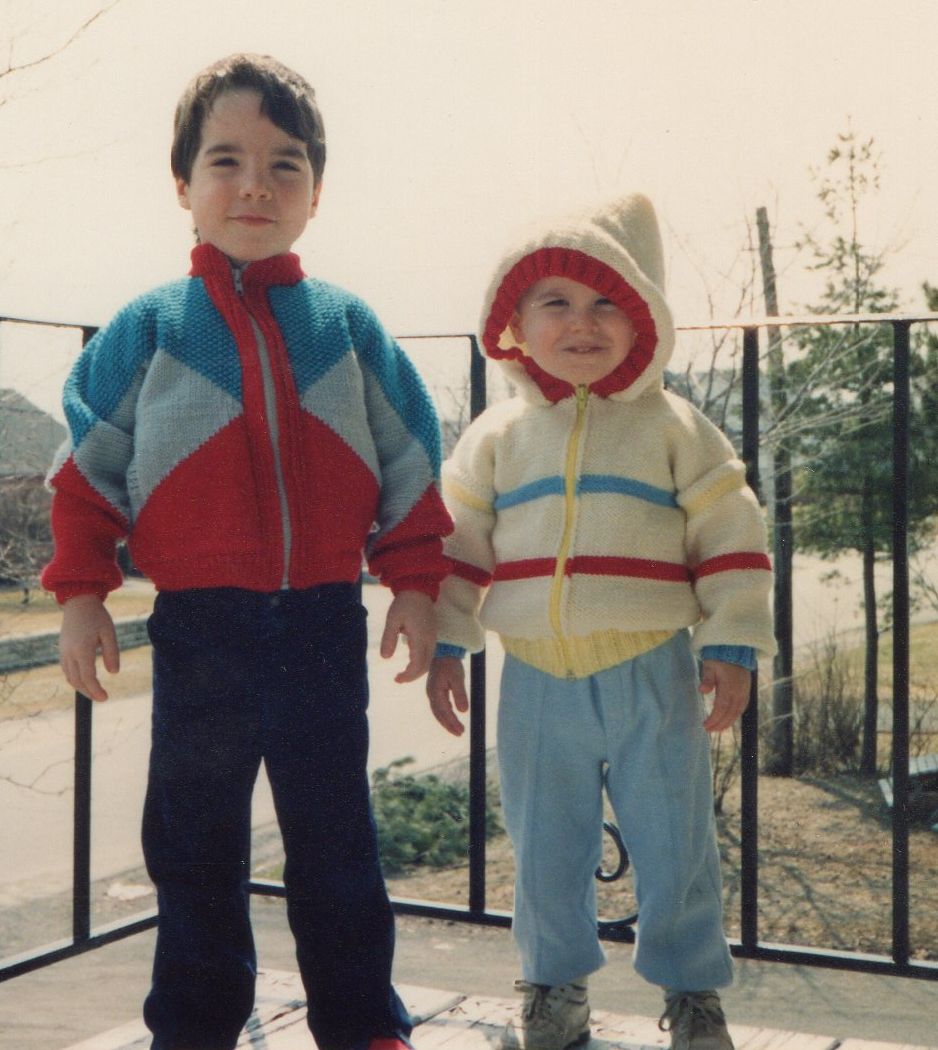 Puis j’ai eu mes enfants et, chose étrange, je n’ai pas tricoté tant que ça pour mes enfants bébés. Je pense que j’étais trop « dans le jus ». Je m’y suis remis quand mon plus vieux a eu 4 ans et mon plus jeune, presque 2 ans. Et pour la 1ère fois, je pense, j’ai pris une photo des vestes que je leur avais fait.