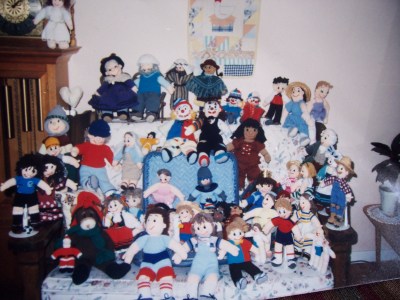 En 1996, décidant que « ça faisait rester à la maison et tricoter », j’ai fait une demande d’admission à l’Université et….j’ai été refusée (c’est-à-dire que j’ai échoué l’examen de français). Quelle déception! Une petite déprime s’en est suivie. Ma réaction face à l’adversité, c’est de trouver quelque chose de nouveau à faire. Et je l’ai fait! J’ai commencé à faire des courte-pointes et des poupées tricotées. J’avais découvert un livre à la bibliothèque municipale: Les poupées de Grand’mère. Ce que j’ai pu en faire des poupées! Je les nommais et les inscrivais sur une feuille. J’ai arrêté de compter à 100. J’en ai donné, vendu et gardé (je dois bien en avoir encore une vingtaine chez moi). Je réservais le livre (à la bibliothèque), le renouvelais, le laissais une semaine et le reprenais. Je dois avoir fait ça pendant 2 ans. Yvan a réussi à le trouver sur internet et me l’a acheté. Par la suite, j’ai créé un modèle beaucoup plus petit que je fais encore, car ça se vend mieux.