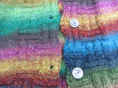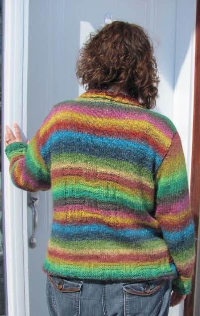 Mon 2ème patron est une veste tout aller. J’ai eu une commandite de Diamond yarn pour la faire: c’est de la Noro silk garden lite, et à cause des couleurs, en la tricotant, je me suis mise à chanter: « Vert…jaune et rouge et bleu. J’ai le soleil dans les yeux ». Alors je l’ai appelé « Vert Harmonium » en l’honneur de cette chanson du groupe Québécois Harmonium. Je pourrais peut-être faire une collection sur des tounes d’Harmonium? On verra…