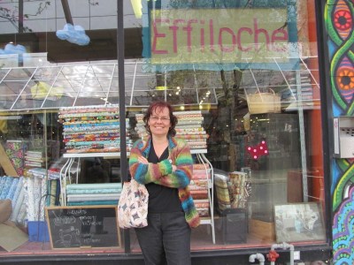 Halte à l’Effiloché: depuis le temps que j’en entend parler! Ah? Ce n’est pas juste une boutique de laine, ils y vendent du tissu aussi. Petite déception, ce ne sera pas si « tricot » que ça…Nous entrons et, wow! Finalement, on retrouve toutes les marques de laine qui m’intéressent, de la Noro en quantité, entre autres. Noro, c’est ma laine fétiche pour le moment: j’en ferai sûrement un « post » à un m’ment d’né. D’ailleurs, la propriétaire a remarqué ma veste (en Noro, bien sûr!).