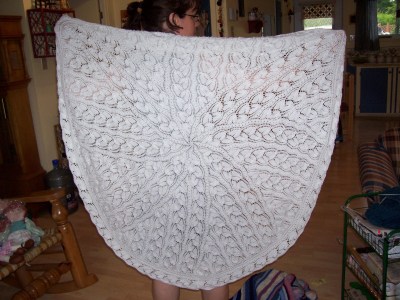 Après ma période « poupées« , (message précédent de ce libellé) j’ai eu le goût de me faire un châle. Un châle tricoté, pas crocheté. Disons que je stagnais depuis une bonne quinzaine d’années: une bonne tricoteuse, sans plus. Je n’avais pas vraiment acheté de livres de tricot (excepté Les Poupées de Grand-mère) ou de revues depuis des lustres. Je dois dire que nous n’avions pas beaucoup d’argent et de plus, avec de jeunes enfants, ce n’est pas la meilleure période pour approfondir quelque chose.