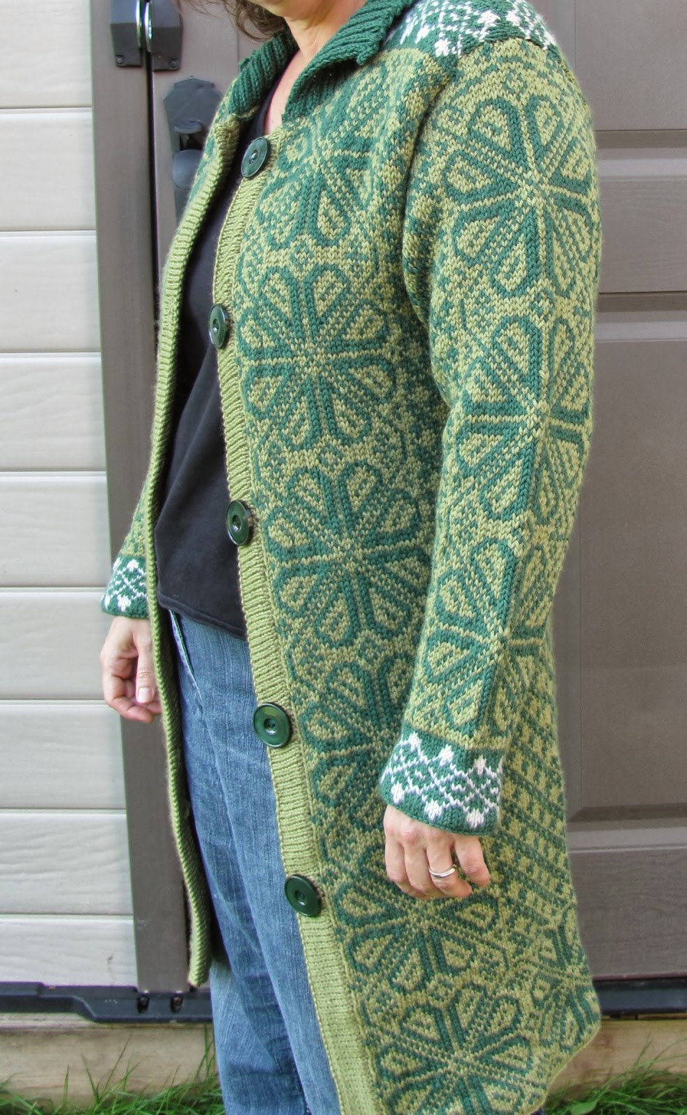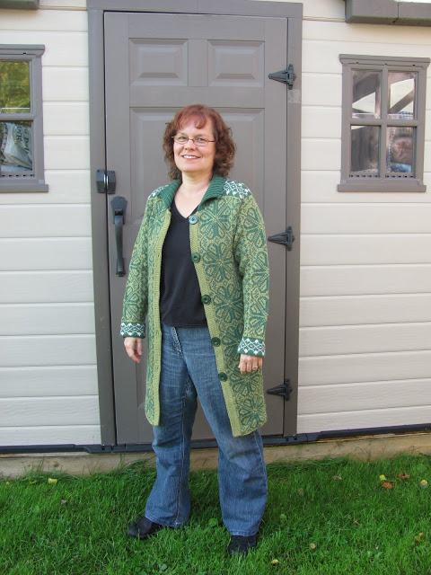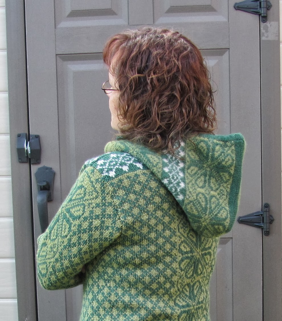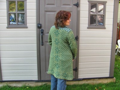 J’ai toutefois fait une gaffe: j’ai oublié de changer de grosseur d’aiguilles après la pliure du bas du corps. Elle est donc un peu petite pour moi. J’ai donc appris qu’en jacquard, on peut changer d’une taille sans modifier quoique ce soit au patron, sauf la grosseur des aiguilles. Qu’à cela ne tienne! Je vais quand même la porter cet automne, mais avant, je vais l’exposer aux « Journées de la Culture », le 29 septembre à mon cercle des fermières. On ne sait jamais, si quelqu’un m’offre un prix intéressant…