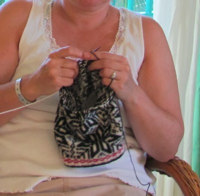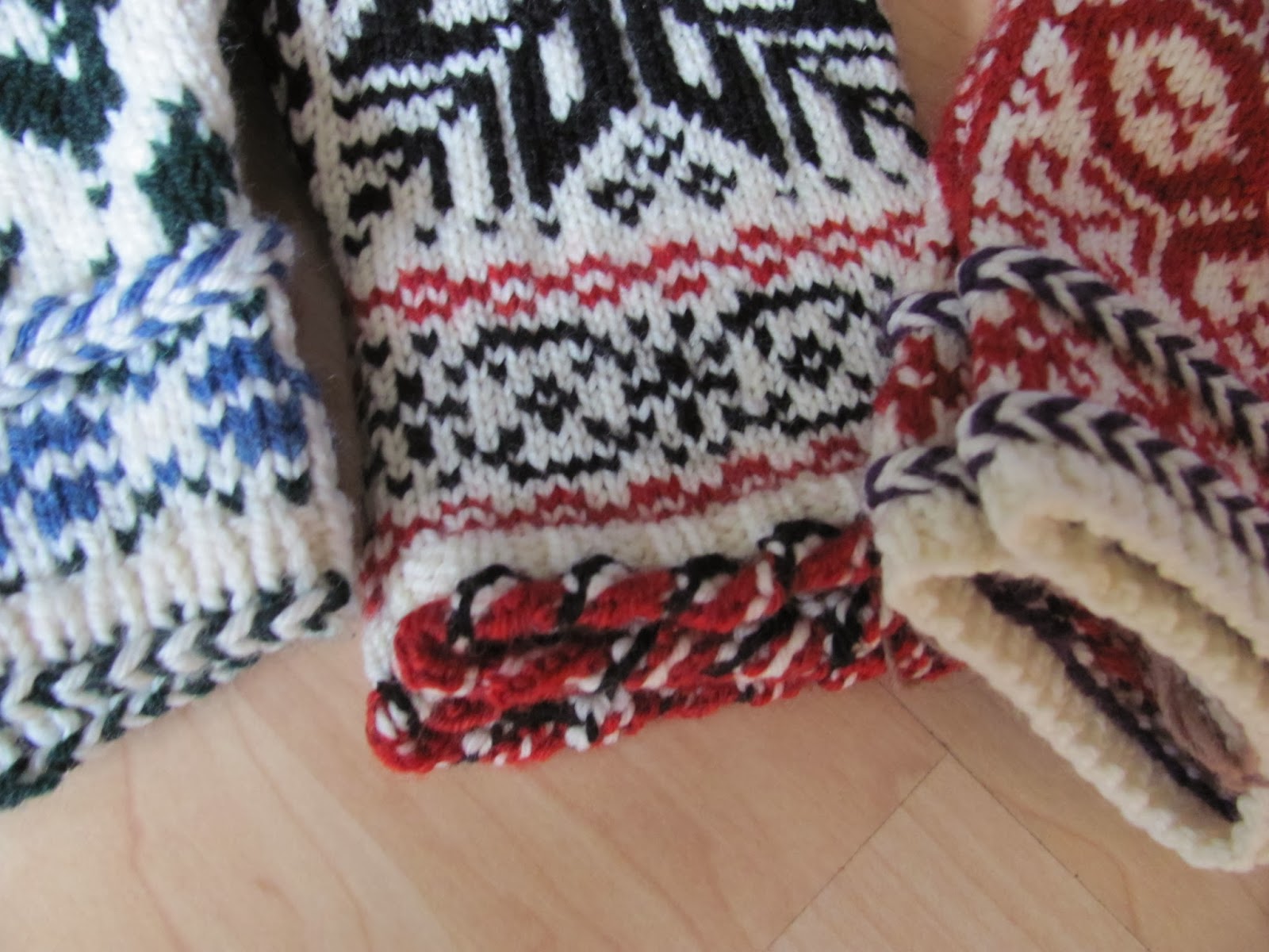 Elle nous a montré aussi les bases de la technique continentale (à 2 mains) pour le jacquard. Je me rappelle avoir demandé si elle avait un livre à nous suggérer pour continuer à faire ce genre de mitaines. Elle m’a conseillé Selbuvotter qui, je le découvrirais plus tard, était sur les mitaines Norvégiennes en fait. J’ai fait tous les patrons de ce livre: 31 mitaines ou gants! Je sais c’est fou, mais j’aimais vraiment ça et c’est ainsi que j’ai acquis les bases d’une bonne expérience de ce type de tricot.