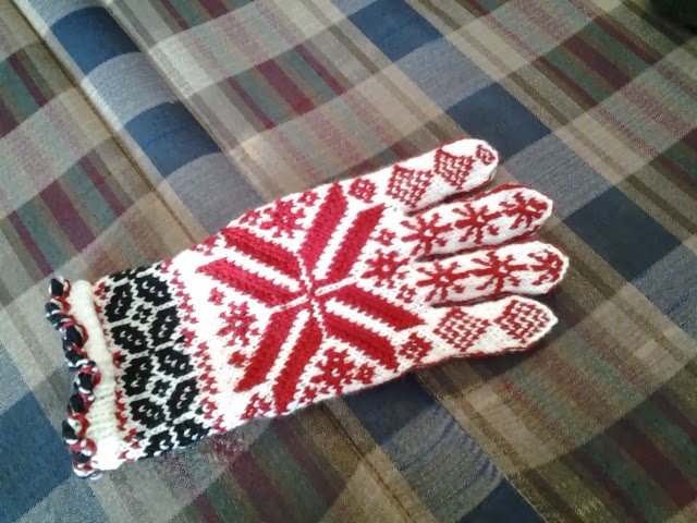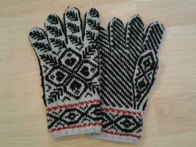 Mais…je ne dois pas arrêter de faire des mitaines et des gants si je veux en avoir pour les expos d’automne. Et mon défi de tricot cette année est de faire 14 paires de gants différents. J’en fais plus que ça durant une année, mais ce sera tous mes patrons, et je n’en ai que 9 de publiés. Alors, je dois faire 5 nouveaux patrons (qui ne seront probablement pas publiés pour le moment). J’en avais déjà « dessiné » 2 avant les fêtes. Voilà le 1er: les gants 4 coeurs.