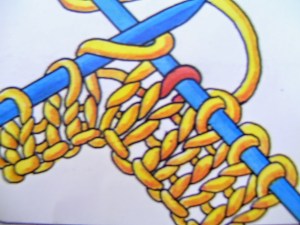 3ème cours, Les points: On apprend les côtes 1/1 et le point de riz (quelques points expliqués ici), puis les petits carrés (tous expliqués dans l’écharpe échantillon du e-book).