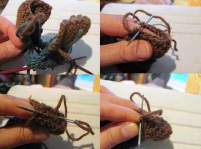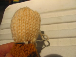 Bras: On tric en aller-retour(même couleur que le corps, puis celle de la tête) Montez 3 m, tric 1 rg envers.