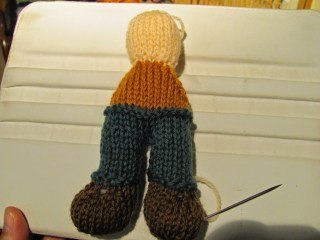 Comme je l’avais dit, le patron est assez similaire à mon patron de petites poupées, donc, il peut être utile d’aller voir le patron et les photos. Mais, disons que le style est différent. Il n’y a pas de yeux, ni de cheveux, mais un « gros » nez, et tout est plus court. Aussi, j’ai utilisé de la laine un peu plus grosse et des aiguilles un tout petit peu plus grosses. Certaines parties sont en aller-retour, mais la plupart est tric en rond.