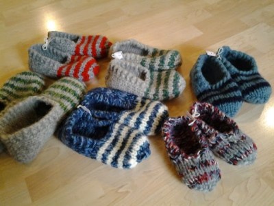 La palme va aux bas: 5 à 12 heures pour une paire de bas pour enfants, et 15 à 30 heures pour des bas d’adultes! Ceux ci-bas: les petits sont les plus rapides, laine pas trop fine et pour un enfant de 1 à 2 ans (5 heures). Et les plus grands sont en jacquard, laine fine et pour homme (30 heures).