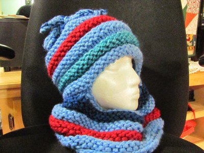 …ou en utilisant 3 fils de grosseurs moyennes tricotés ensembles. On utilise des aiguilles circulaires de 9mm et 10mm. La 1ère est une 40cm/16 » et la 2ème peut être une 60cm/24 ».