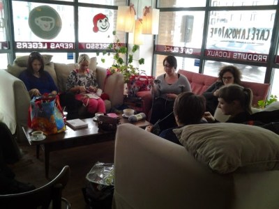 J’ai eu ma 2ème rencontre tricot-thé à Lévis vendredi dernier. Organisée par Suzanne, nous nous retrouvons au café La Mosaïque (café coopératif) à Lévis. Rappelez-vous: c’est tous les vendredis après-midi et c’est ouvert à tous! Mais moi j’y vais une semaine sur 2.