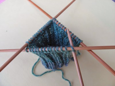 Si vous avez fait tel quel pour le 1er cours, vous avez déjà des aiguilles double-pointes. Ce qu’il faut savoir, c’est que vous pouvez travailler avec 4 aiguilles (le travail est divisé en 3 parties et une 4ème aiguille sert pour tricoter) ou avec 5 aiguilles (le travail est divisé en 4 parties et une 5ème aiguille sert pour tricoter). La 1ère façon est plus confortable, mais plusieurs patrons sont plus faciles à comprendre avec 5 aiguilles.