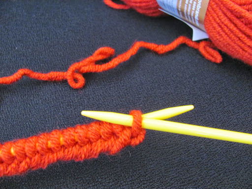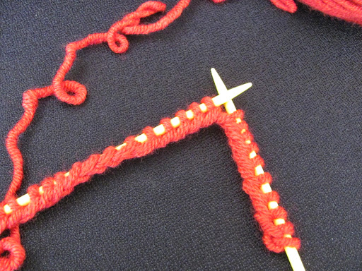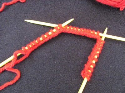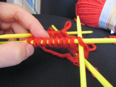 Par la suite, faites des côtes 2/2 (2 mailles à l’endroit et 2 mailles à l’envers sans arrêt) pour une dizaine de rangs. Si vous voulez que ceci devienne quelque chose, vous pouvez continuer avec ce patron de petit poignet décoratif, mais peu importe, à ce point, vous êtes prêt à faire un projet.