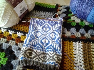 Je fais une paire de bas par mois au moins. Voici ceux d’avril ci-haut que je fais à partir d’un de mes patrons de gants (je vous expliquerai ça à un moment donné)