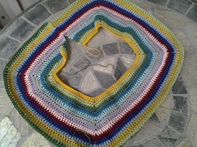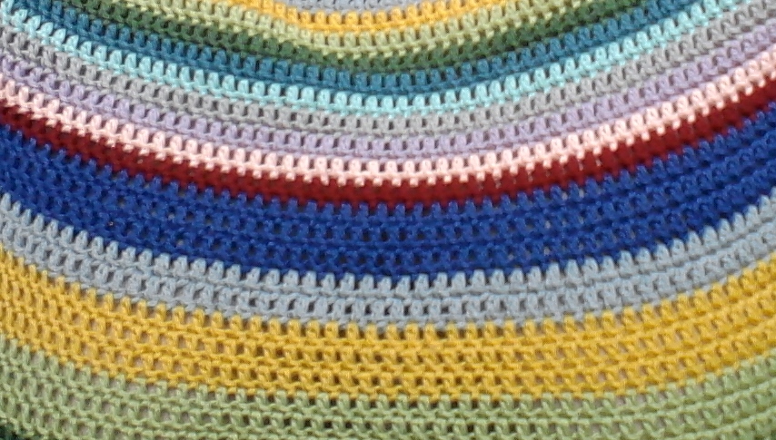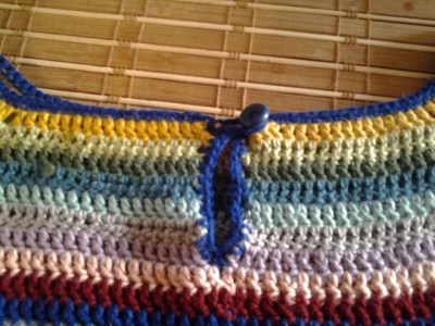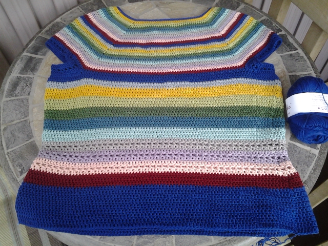 Ce n’est pas important mais j’ai fait des rayures, c’était moins ennuyant (trop simple, ça m’ennuie). Beaucoup de rayures avec beaucoup de couleurs! Des fines (un rg seulement) et des plus larges (3 rgs).