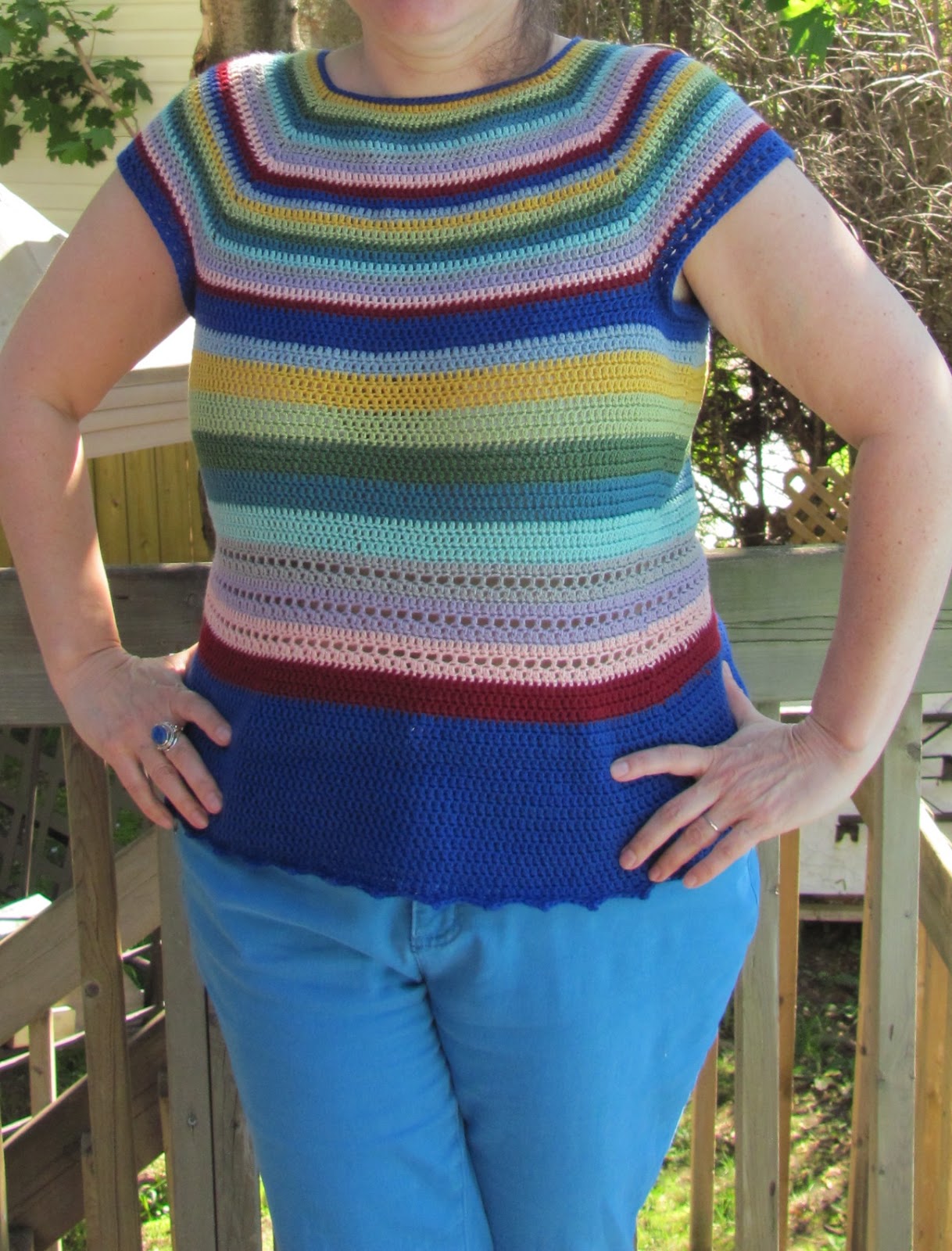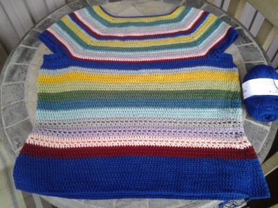 Au 7ème rg, commencez à crocheter en rond (on ferme chaque tour par une mc dans la 3ème ml des 3mls du début de ce rg) et continuez de faire les augm, mais un rg sur 2 (le rg sans augm, on fait seulement 1ml vis-à-vis la ml du rp). Continuez jusqu’à 200 bs totales, puis faites un dernier rg où vous ferez dans chaque espace d’une ml *2 bs*. Vous aurez donc 204 bs totales (oui, c’est plus que le chiffre que j’ai choisi mais c’est nécessaire car on est au niveau des épaules). Continuez de tricoter sans faire d’augm jusqu’à avoir la profondeur d’emmanchure qui vous convient.
