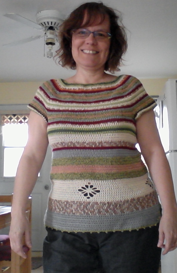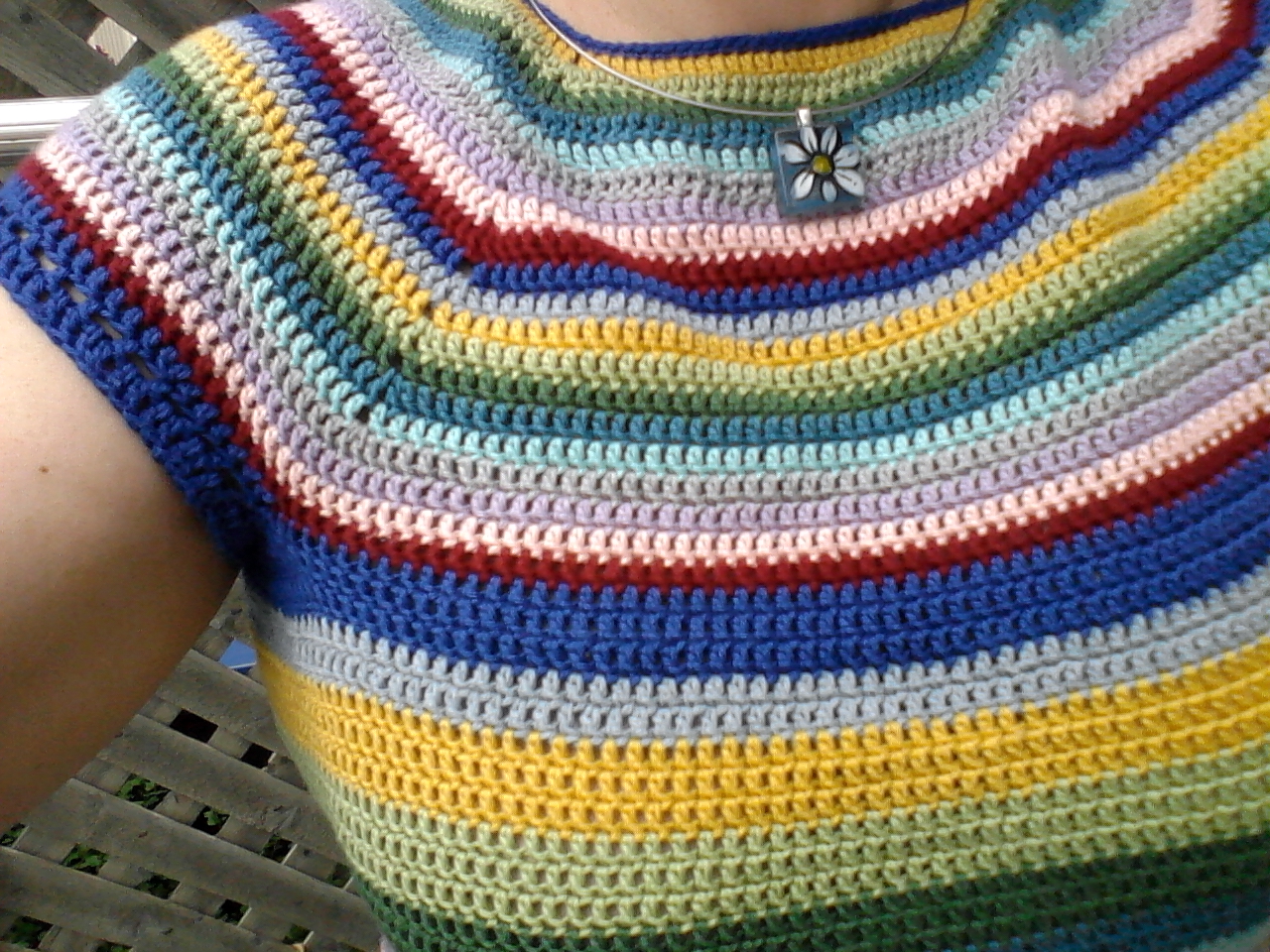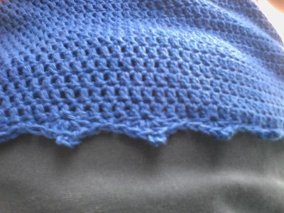 Aussi, à la taille, j’ai fait quelque fois un rg de filet: *1 bs, 1ml, sautez 1 bs du rp* pour tout un rg. Je pourrais y faire passer une courroie si je voulais…