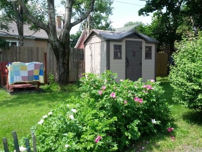 Ce dernier coin n’a pas encore été « habillé » encore. J’ai sorti cette couverture que je laisse ainsi pour le moment. Mine de rien, je voulais vous montrer nos rosiers du bas du fleuve qui fleurissent abondamment enfin! Et voici, mes tricots en cours…