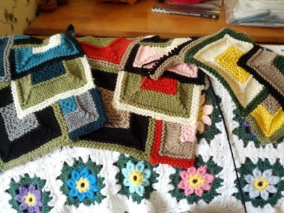 La dernière image sera probablement mon gros travail jusqu’au printemps: une nouvelle couverture avec aussi 2 techniques de tricot, un peu comme celles de la couverture de 2013. Cette fois, ce sera le tricot modulaire et…? Je ne sais pas encore: peut-être encore des torsades, mais j’y réfléchis.