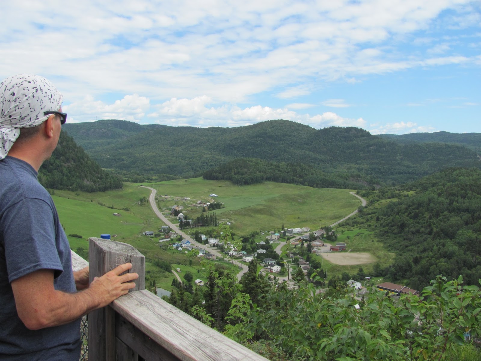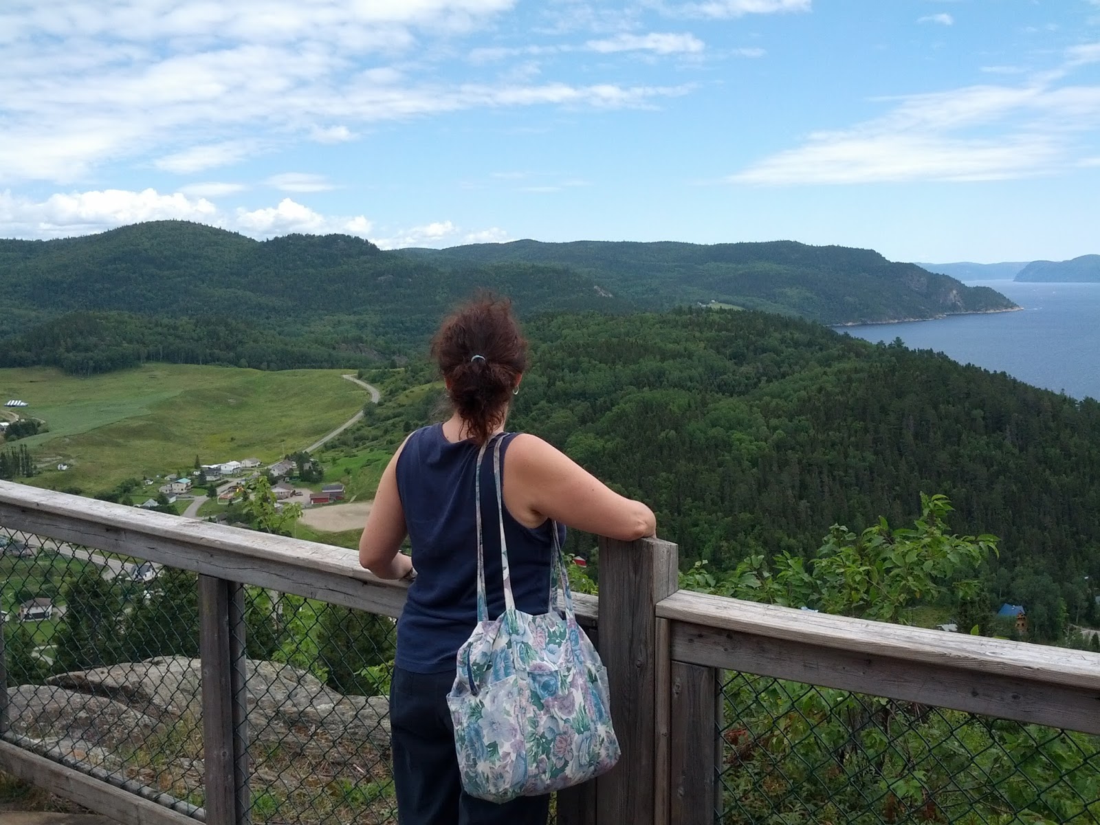 Pour la vue extraordinaire, plus haut (sentier du plateau, au bout de la rue de la Montagne), la personne au kiosque d’information touristique nous avait dit que c’était plat et « pas loin ». Si bien que, quand nous nous y sommes engagés, j’étais convaincue que nous nous étions trompés. Yvan m’a suggéré de « rester là », qu’il irait voir plus loin si c’était bien le sentier en question. Mais, le sentier (par son côté isolé en forêt) ne me rassurait pas du tout. Je lui ai répondu: « Pas question que tu me laisses icitte tu seule! » (la version « Québécois primitif » est sortie de moi avec une grande spontanéité)