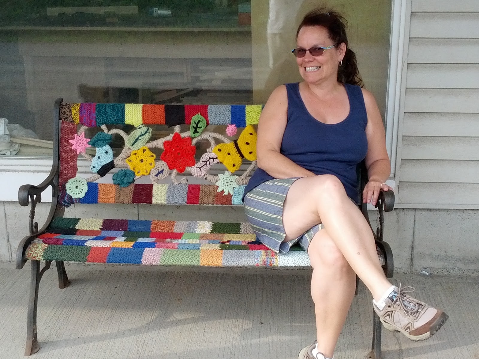 Je termine avec une photo de moi sur le banc à Lauzon que je viens de trouver.Très beau le banc! On ne peut pas en dire autant de moi qui n’est..pas exactement sur « mon 36 »! Pas grave! Ne soyons pas trop fière! Je ne suis pas une « top modèle », seulement une tricoteuse passionnée. Et, sans les avoir rencontrées personnellement, j’en ai trouvé plein d’autres au travers leurs œuvres exposées en plein air.