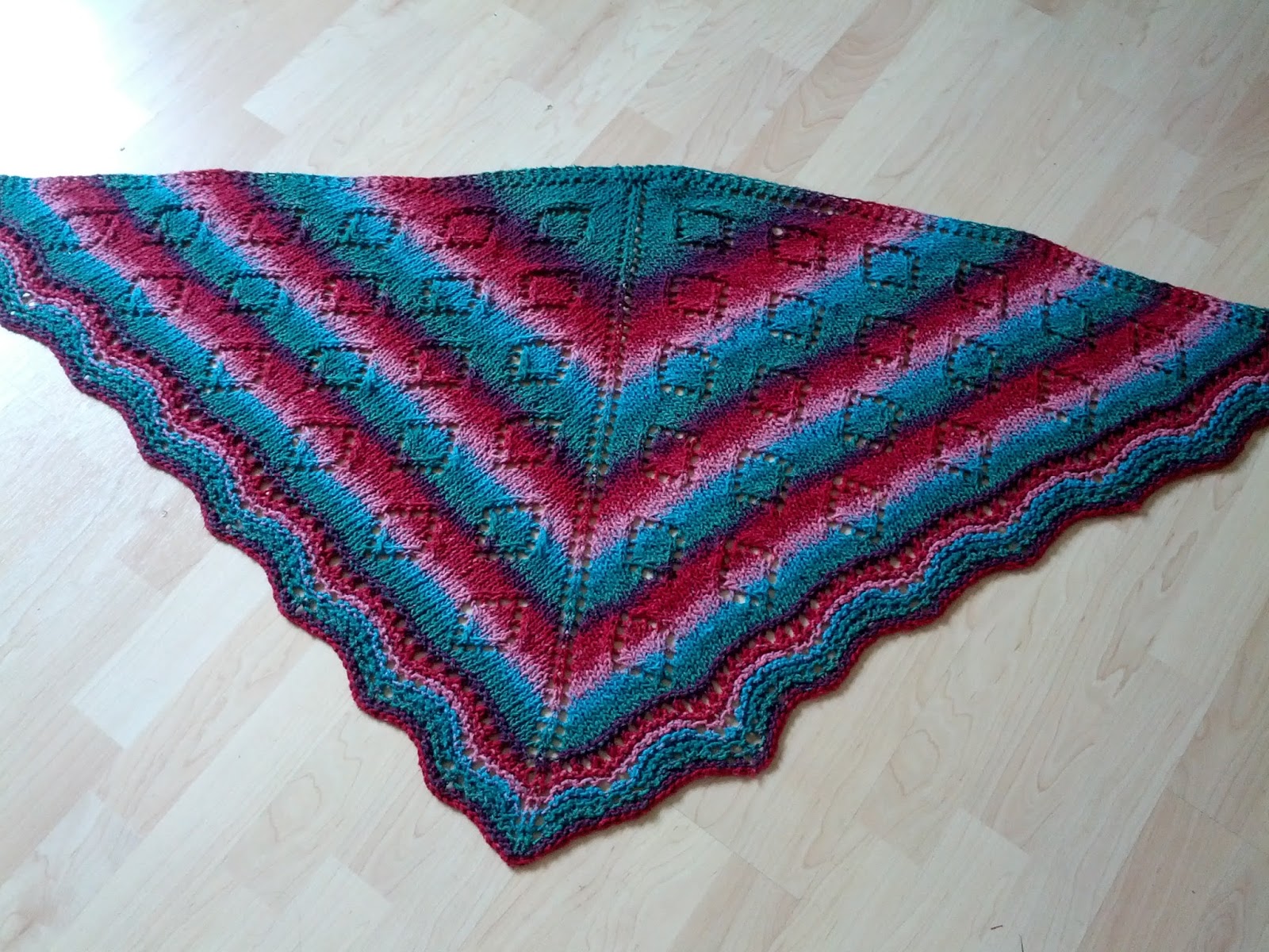 Par la suite, j’ai fait ce châle, comme le petit bleu montré dans ce message, mais en plus grosse laine, tricoté avec des 6 mm: Ce patron va être publié…éventuellement.