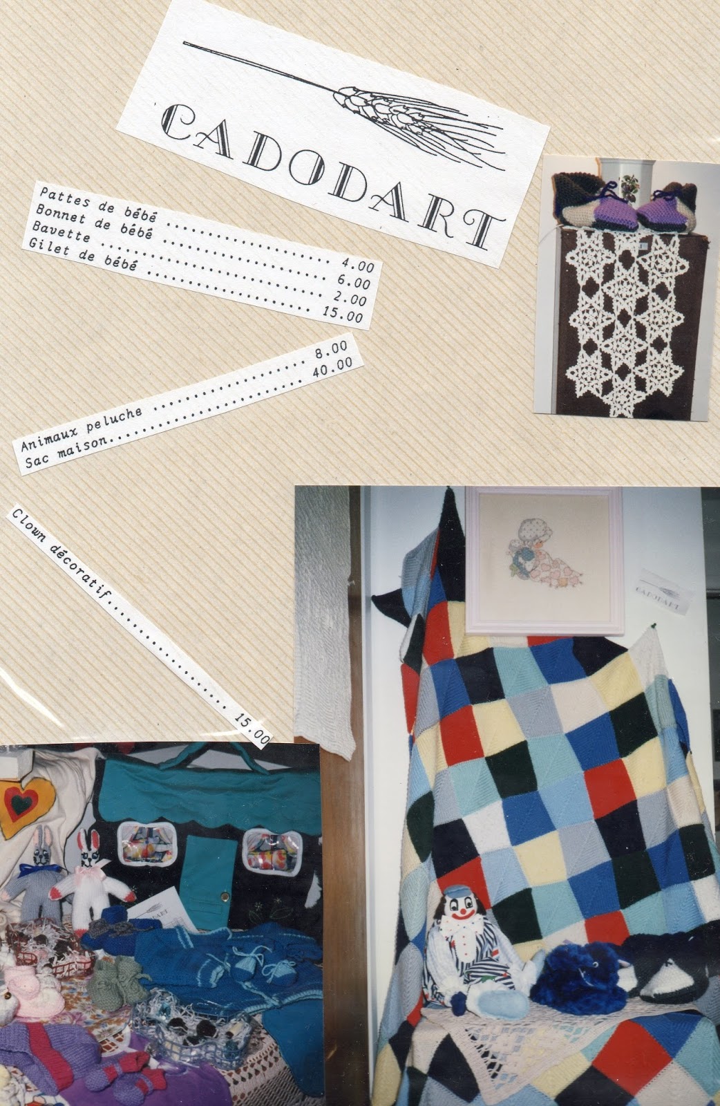 L’autre jour, je suis tombée sur un album que j’avais fait pour, ce que j’aurais voulu, une petite entreprise: Cadodart. C’était il y a 20 ans. J’essayais de vendre des choses faites à la main, et j’en ai vendu (il faut le dire). J’ai même fait une couple de fois, une « réception à la Tupperware » pour vendre des choses, et ça avait très bien marché la 1ère fois.