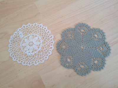 Et juste la table à droite des Alpagas Amazone, j’ai eu le plaisir de côtoyer les sœurs Couture, Lise et Francine, et leur mère, madame Falardeau. Franchement, c’est un de mes plus grands plaisirs de les retrouver à chaque année. Ma 1ère exposition à cette expositions, elles étaient juste à côté de moi, et cette année, juste en face. Madame Falardeau est surprenante, une force de la nature: elle a travaillé très fort sur le tricot-graffiti qui ornait les rampes en entrant. Et en finissant, elle m’a fait cadeau de ces 2 petits napperons finement crochetés. Je leur cherche la meilleure place d’honneur dans ma maison!