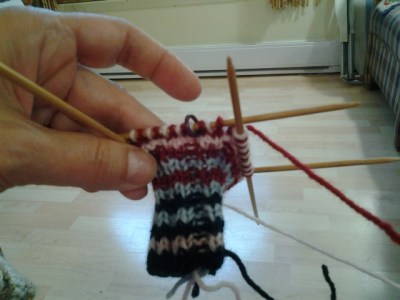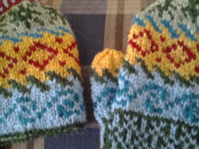 Après, pour la main, c’est une répétition de 8 mailles qui se fait jusqu’avant le bout de la main. Puis le bout n’est que d’une couleur. Le pouce commence avec un rang d’une seule couleur. On ne coupe pas cette laine et on fait un autre rang avec une 2ème couleur. Ces 2 couleurs sont celles utilisées pour le jacquard du pouce. Le bout du pouce, avec ses diminutions est d’une seule couleur aussi.