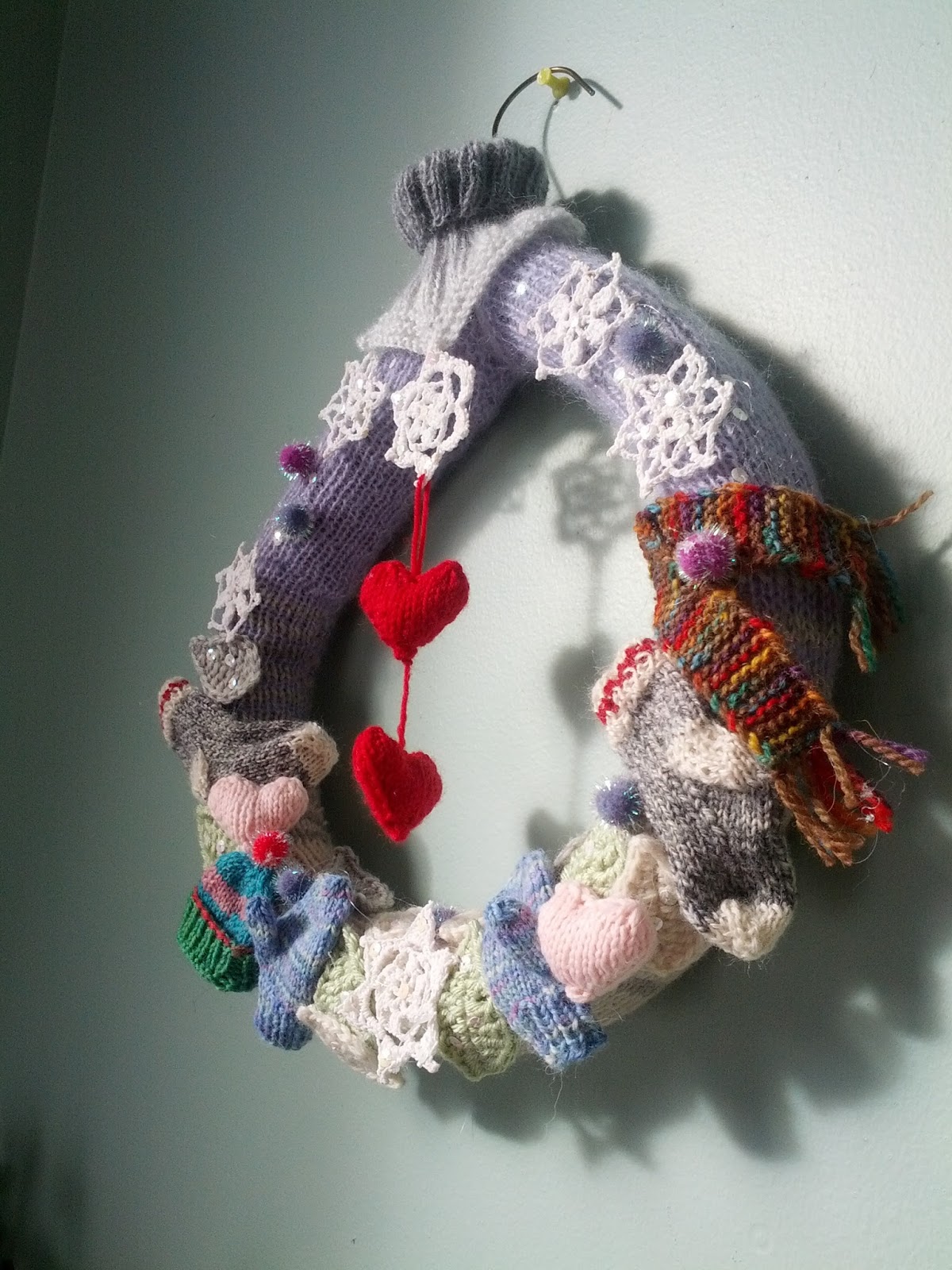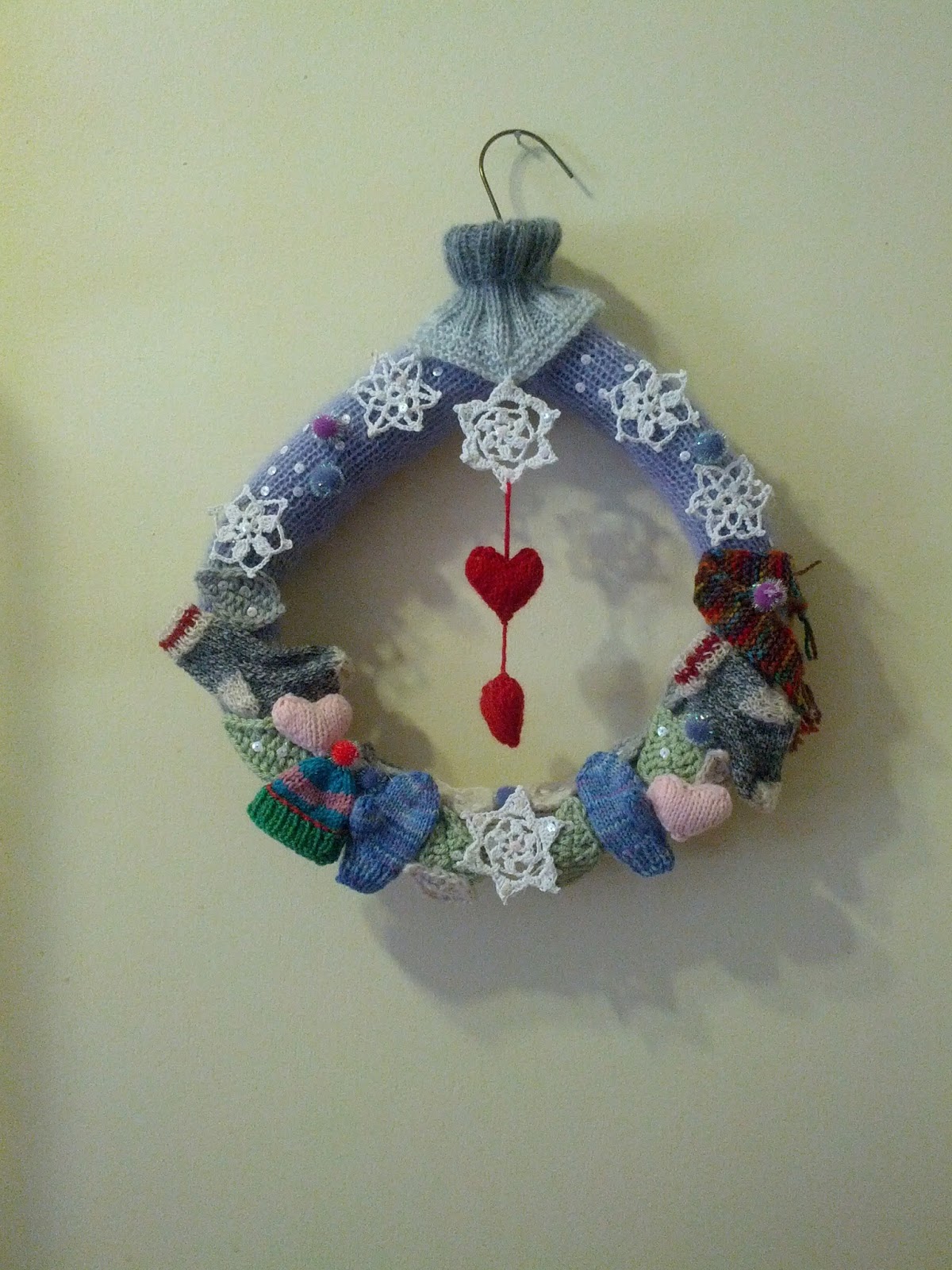 J’ai sorti un petit sachet de paillettes irisés que j’ai parsemés (cousu avec du fil à coudre) sur mon fond, les flocons et les feuilles. Ah oui! J’ai trouvé de touts petits pompons brillants. Le col a servi à suspendre un flocon et 2 petits cœurs. Par la suite, j’ai sorti mon fusil à colle et j’ai fixé le tout un peu aléatoirement. Et voilà!