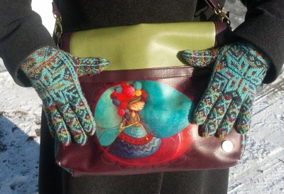 Les mitaines: On monte 20 ms, 10 rgs de côtes. Puis un rg end avant de débuter le gousset. Il y aura 3 X 2 augm pour le gousset (à tous les 2 rgs) de chaque côté d’une m, donc 7 ms en attente pour le pouce. On finit la mitaine: 12 rgs avant le bout, 4 dim au bout jusqu’à ce qu’il reste 8 ms totales.