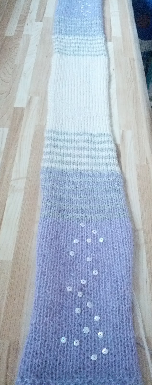 L’écharpe: Montez 7 ms et tric tout end (en aller-retour) jusqu’à la longueur désirée. Posez de la frange.