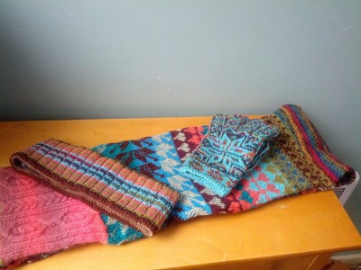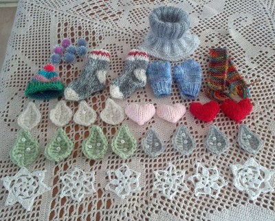 Puis, viennent les petits éléments qu’on y ajoute au choix: petites mitaines, petits bas, petite tuque, petit écharpe et petit col. Ils sont tous en fingering (laine no 1, alors des restes de laine à bas, c’est parfait!), tous tricotés avec des 2.5mm. Explications très « en bref ».