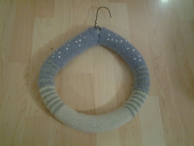 Pour le reste, c’est tricoté et pas crocheté. On commence par une bande qui couvrira une espèce de couronne que petit mari m’a bidouillé sur un cintre de métal auquel il a donné une forme arrondie, puis y a mis du couvre-tuyau en mousse.