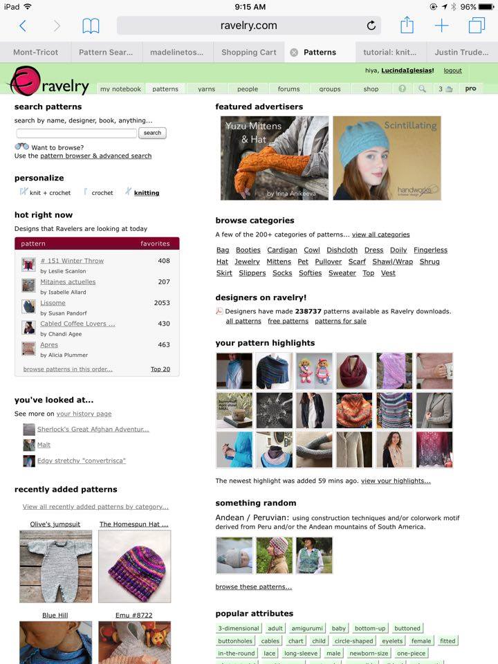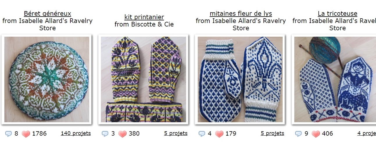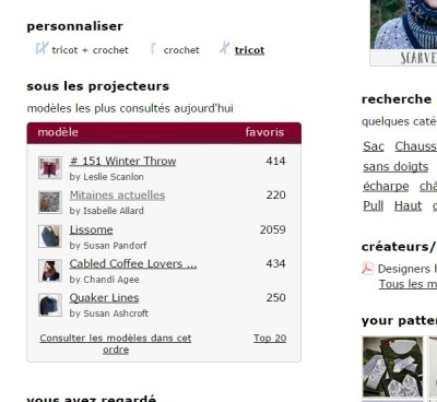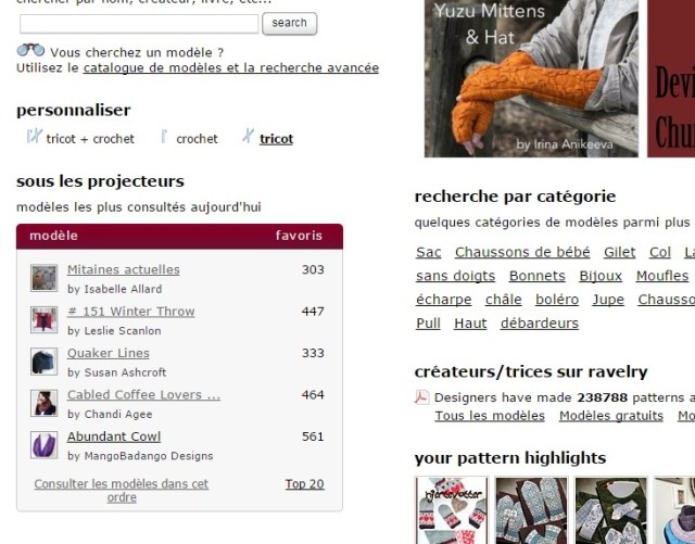 Dans la page de patrons de ravelry, il y a toujours une petite fenêtre montrant les pages de patrons les plus « fréquentées » et…je suis en 2ème (enfin, mon patron mitaines actuelles)! J’avais bien vu que ma boîte courriel était, comment dire, beaucoup occupée à recevoir des notifications de téléchargements sur ravelry! Oui, c’est parce que le patron est gratuit, mais ravelry, c’est six millions de membres de partout dans le monde! Il y a beaucoup de patrons et beaucoup qui sont gratuits.