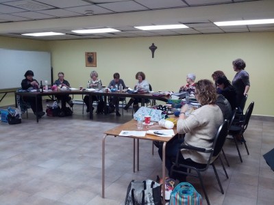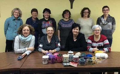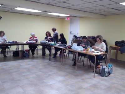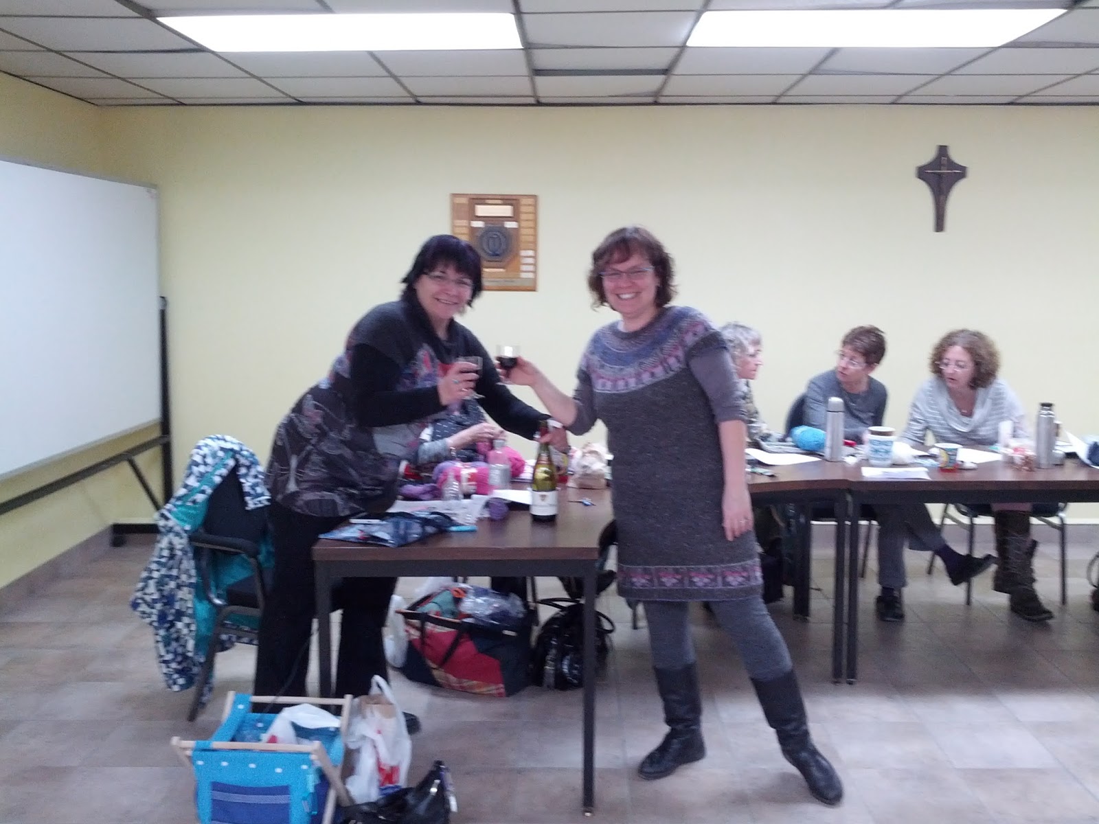 Maintenant, samedi, je suis allée à St-Antonin, dans le bout de Rivière-du-Loup pour aller donner un cours de jacquard. Ça a été super! Joane Dumont, l’organisatrice m’a tout d’abord donné, en cadeau de bienvenue, une jolie balle teinte à la main par elle-même. Puis, tout s’est bien déroulé: un beau groupe de dame sympathiques et allumées. À la toute fin, France, qui disait participer à des « vin-dredis » tricot (ou même organiser peut-être) à l’atelier « Les doigts en folie » à Rivière-du-Loup, a emmené une bouteille de vin. Vu que j’avais trouvé ça très drôle quand elle en parlait, elle a voulu être gentille. Donc, une belle journée!