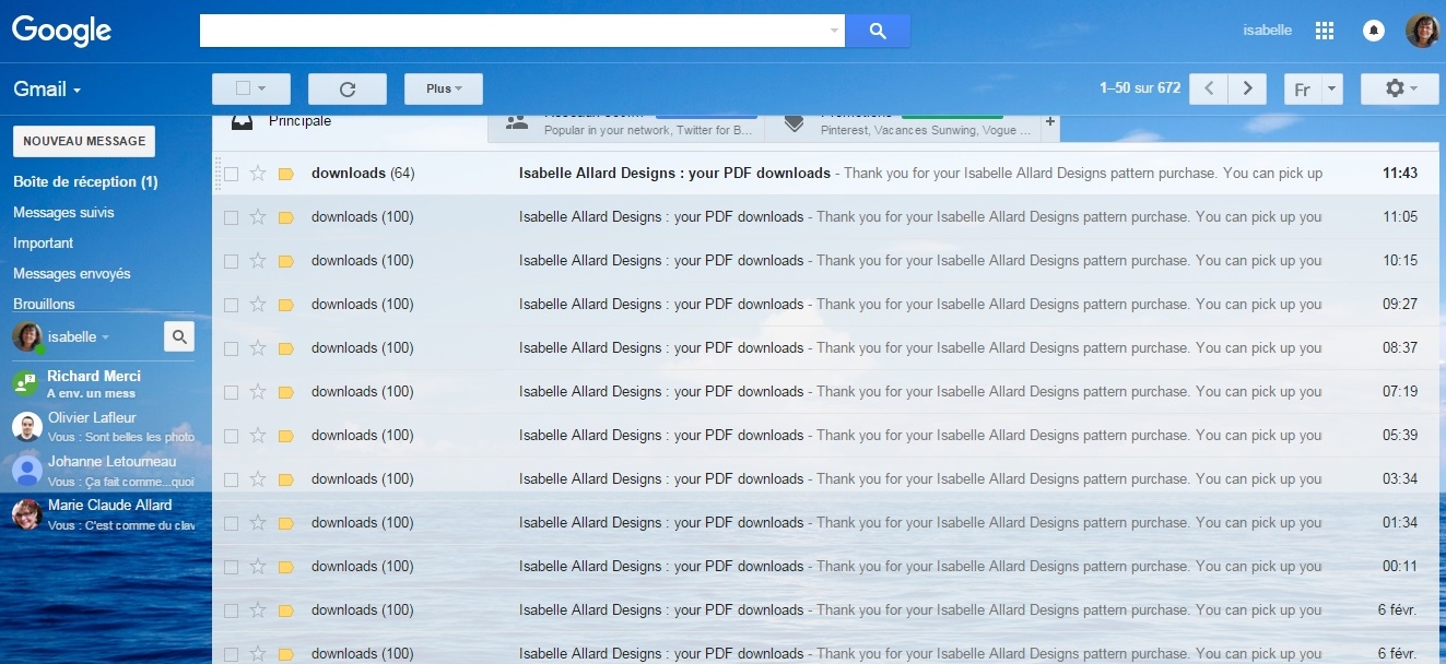 Ensuite, dimanche, je me lève un peu fatiguée de ma journée de la veille. Alors je décide de rester à la maison plutôt que d’aller à l’église (et oui). J’ouvre ma tablette, pas très tôt d’ailleurs, et j’ai un message privé sur ma page facebook de Lucinda Iglesias (propriétaire de la boutique Mont-tricot) pour me montrer ceci: