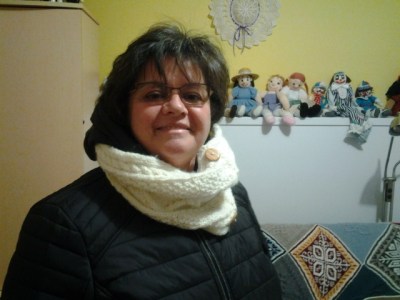 | Barbara qui porte son col, dans mon « salon » de tricot |