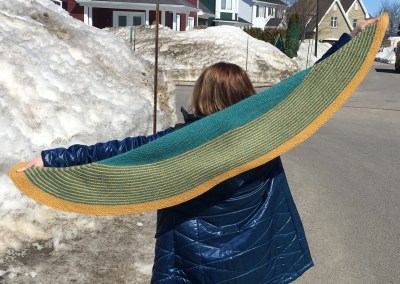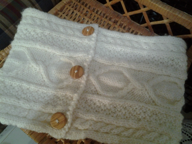 Dans mes cours privés, j’ai de bonnes et agréables élèves. L’une d’elles, Barbara, est plutôt douée. Elle a appris les torsades et je lui ai fait faire le motif de torsades que j’ai fait l’automne passé pour une élève et que j’ai intégré dans mon col Tricoti Sibbern Bohn. (Oui, celui de la grille!). Sauf qu’il a été fait, dans le cas de Barbara, avec 2 ms de plus de chaque côté (soit 4 ms end sur l’end et env sur l’env, au lieu de 2). Il y a 64 ms en tout, en laine no 4 (worsted) avec des 5.5 mm. Il est fait en aller-retour, et elle a décidé de poser des boutons. Joli hein? Et maintenant, elle attaque le jacquard. Rien ne l’arrête: elle est débrouillarde et créative.